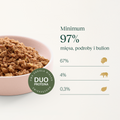 67,1% indyk (54,1% mięso, 13% podroby: wątroba, żołądki), 27,6% bulion, 4% dzik (4% mięso), 1% witaminy i minerały, 0,3% kocimiętka